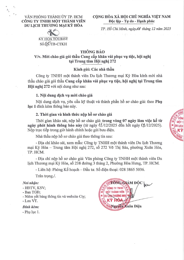 THÔNG CHÀO GIÁ GÓI THẦU CUNG CẤP KHĂN VẢI PHỤC VỤ TIỆC, HỘI NGHỊ TẠI TRUNG TÂM HỘI NGHỊ 272