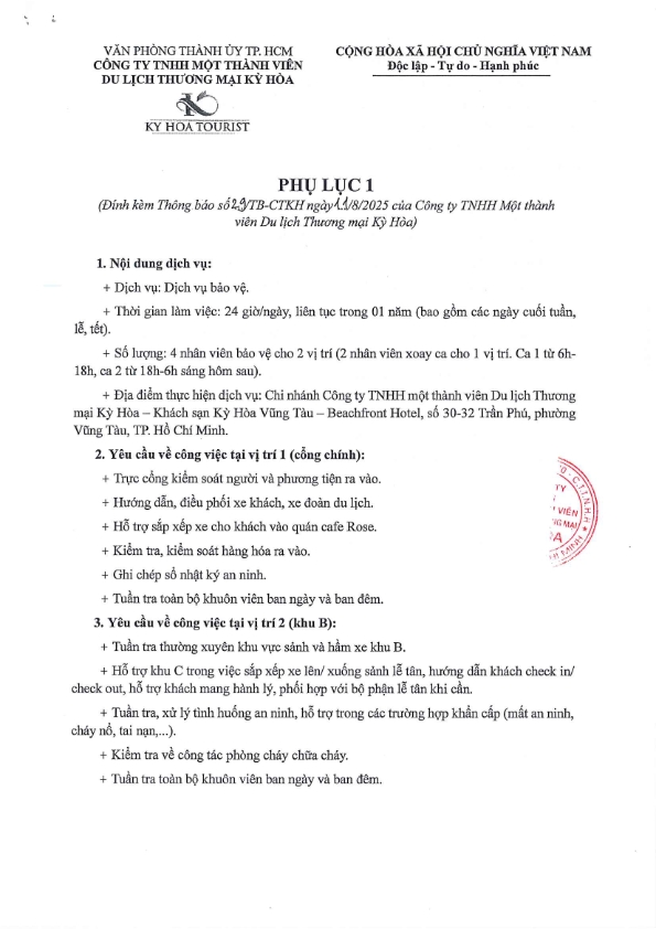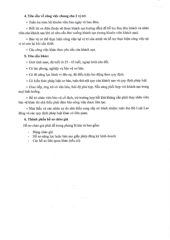 THÔNG BÁO CHÀO GIÁ GÓI THẦU CUNG CẤP DỊCH VỤ BẢO VỆ TẠI CHI NHÁNH KHÁCH SẠN KỲ HÒA VŨNG TÀU