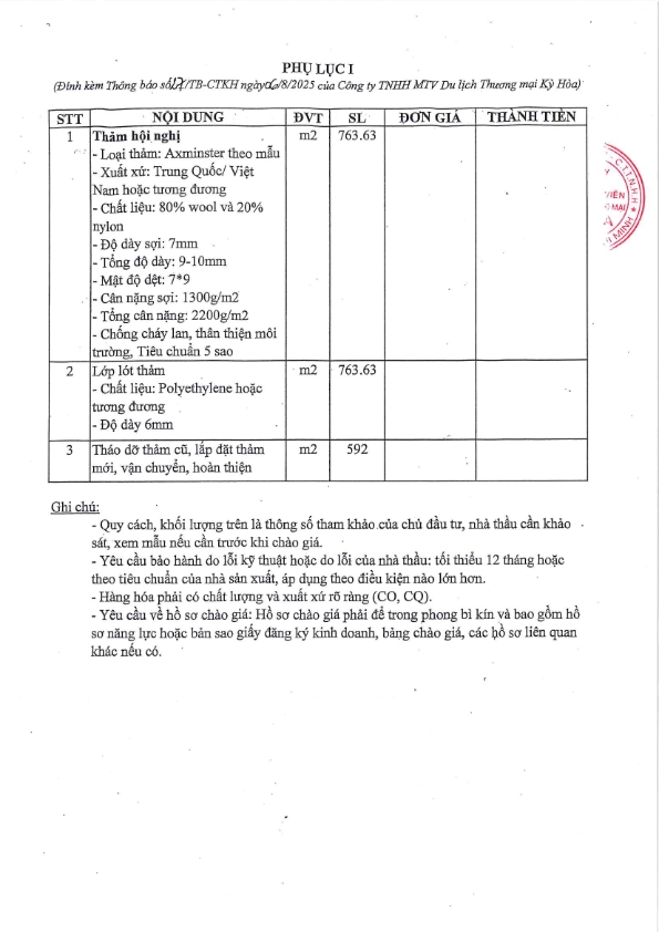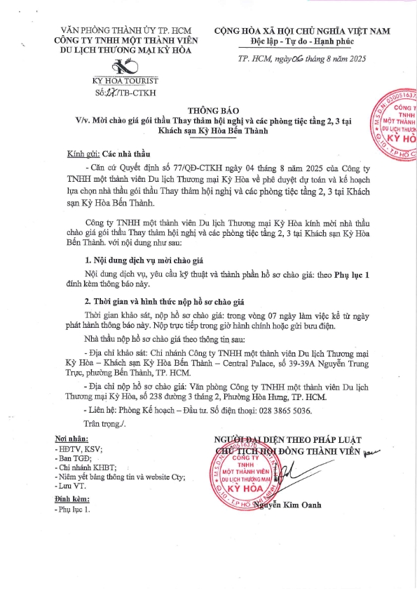 THÔNG BÁO MỜI CHÀO GIÁ GÓI THẦU THAY THẢM HỘI NGHỊ VÀ CÁC PHÒNG TIỆC 2,3 TẠI KHÁCH SẠN KỲ HÒA BẾN THÀNH
