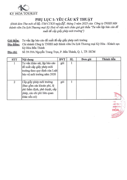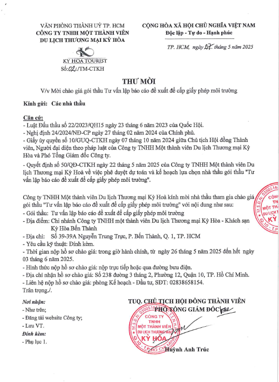 THÔNG BÁO MỜI CHÀO GIÁ TƯ VẤN LẬP BÁO CÁO ĐỀ XUẤT CẤP GIẤY PHÉP MÔI TRƯỜNG CHO KHÁCH SẠN KỲ HÒA BẾN THÀNH