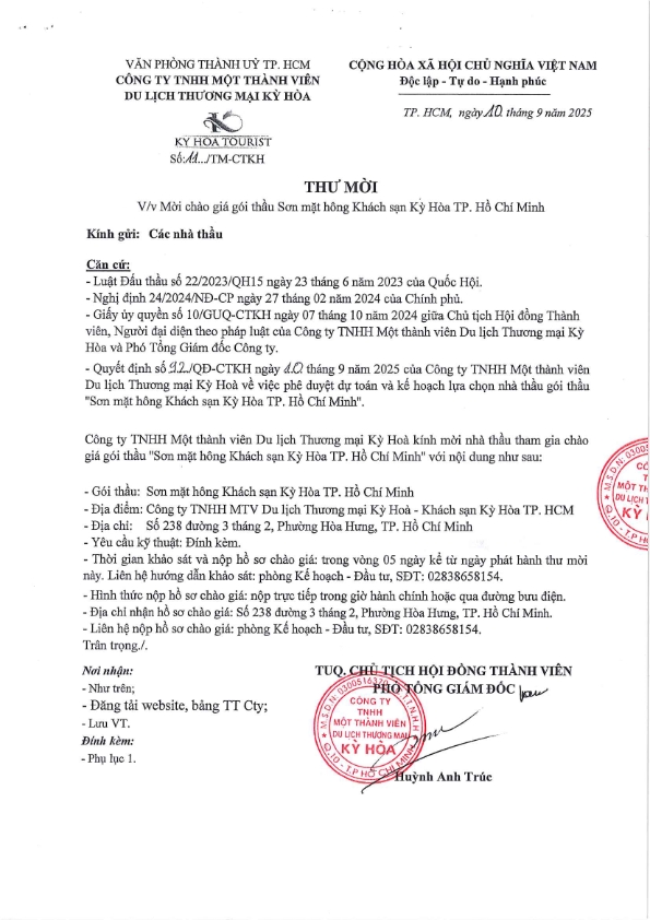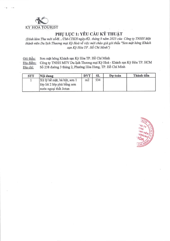 THƯ MỜI CHÀO GIÁ GÓI THẦU SƠN MẶT HÔNG KHÁCH SẠN KỲ HÒA HỒ CHÍ MINH